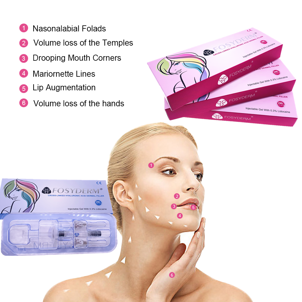 Hyaluronic Acid Dermal Filler gels are widely used as dermatological fillers and have shown their superiority to collagen thanks to greater safety and longevity. The Fosyderm range utilizes technologies to stabilize highly pure Hyaluronic Acid into a gel form that allows it to last long in the skin, smoothing the surface, and providing lift and support where needed. Fosyderm Dermal Filler is CE marked and comes in three different versions, Soft (Fine Lines), Medium (Derm Lines) and Hard (Deep Lines). It is of extremely high quality and we have proven long lasting incredible results. If you are looking for a high-quality filler with Lido or without Lido then Fosyderm range is currently the ONE. The range has an outstanding resistance to degradation meaning longer effect duration, as well as high elasticity and viscosity values, which ensure even distribution of the gel in the dermal layers. High cross-linking rates means a smoother application.